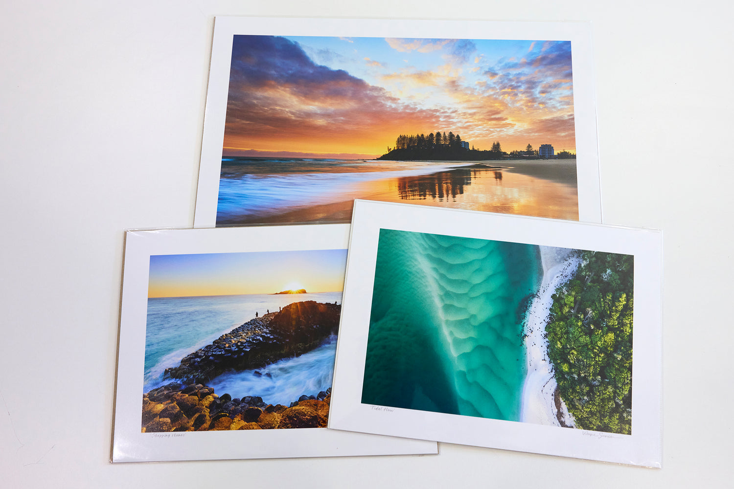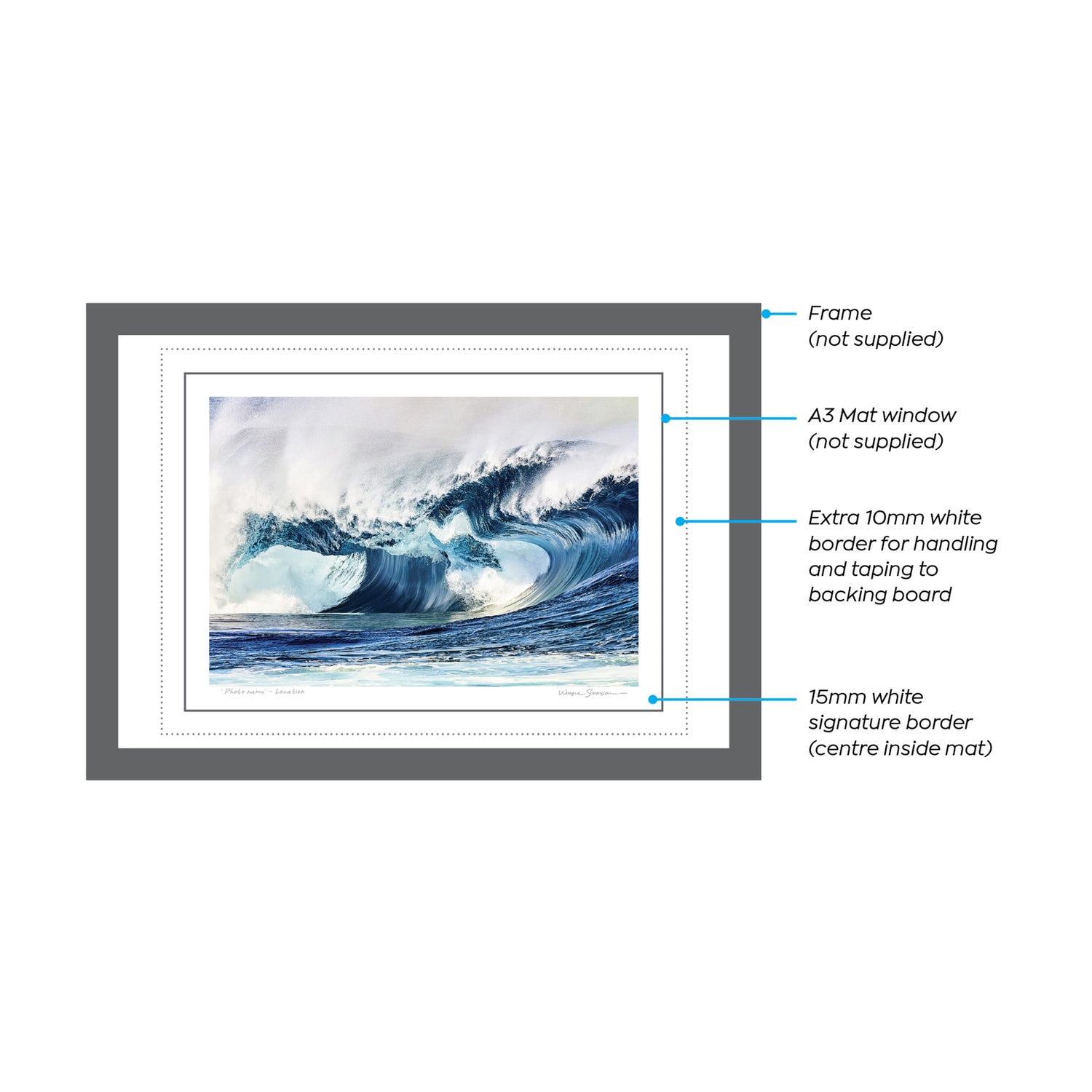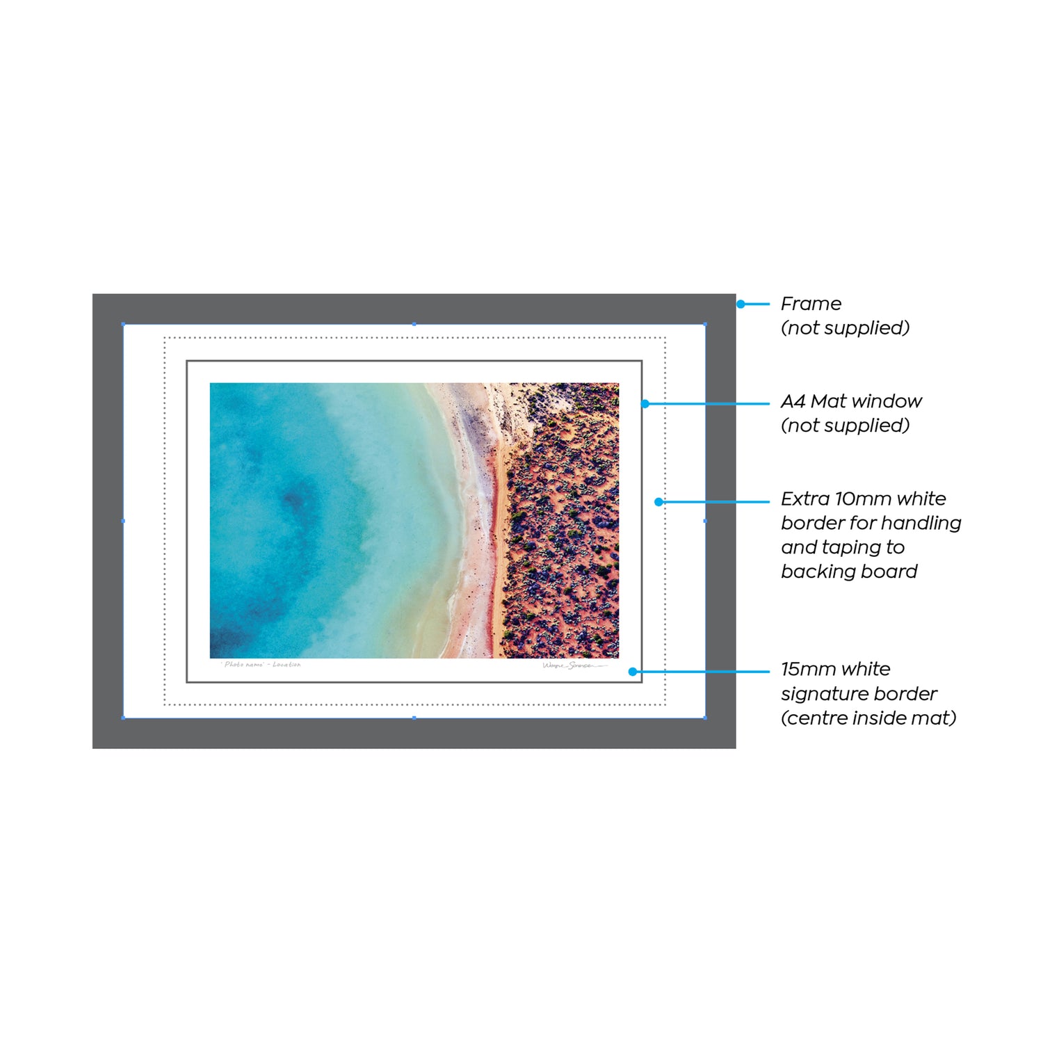 Available in A4, A3 and A2 sizes only, these unframed prints are our most affordable prints. Printed on Smooth Pearl Photo Paper, these prints include a white border with signature and title for a gallery quality finish.