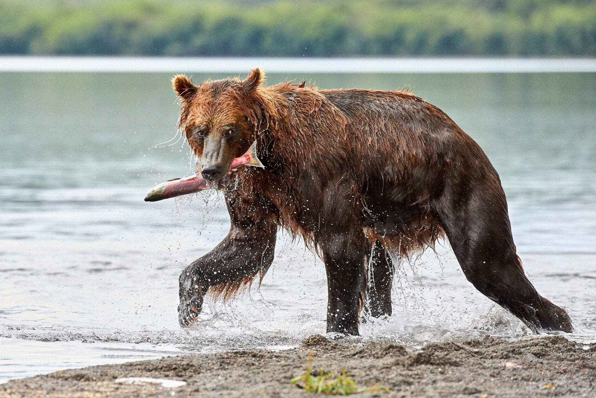 A brown bear returns to shore with his prize catch at Kurilskoye Lake (also known as Kurile Lake) in Kamchatka Russia. Despite their brute appearance, brown bears quite delicate in eating their salmon. They almost always bring it to shore, where on the beach, they deftly remove the skin before devouring the flesh.