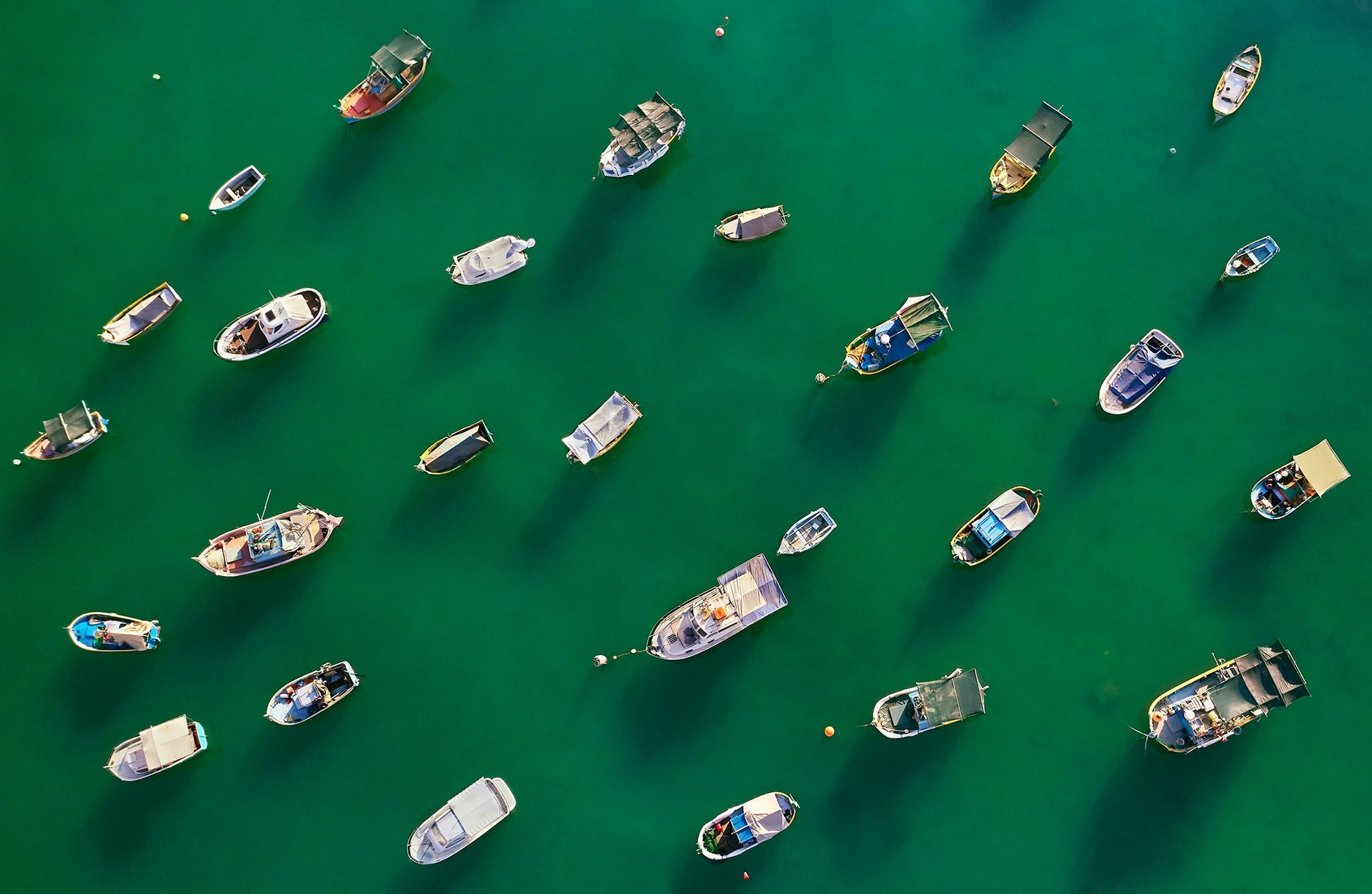 At anchor - Aerial over Marsaxlokk fishing village, Malta