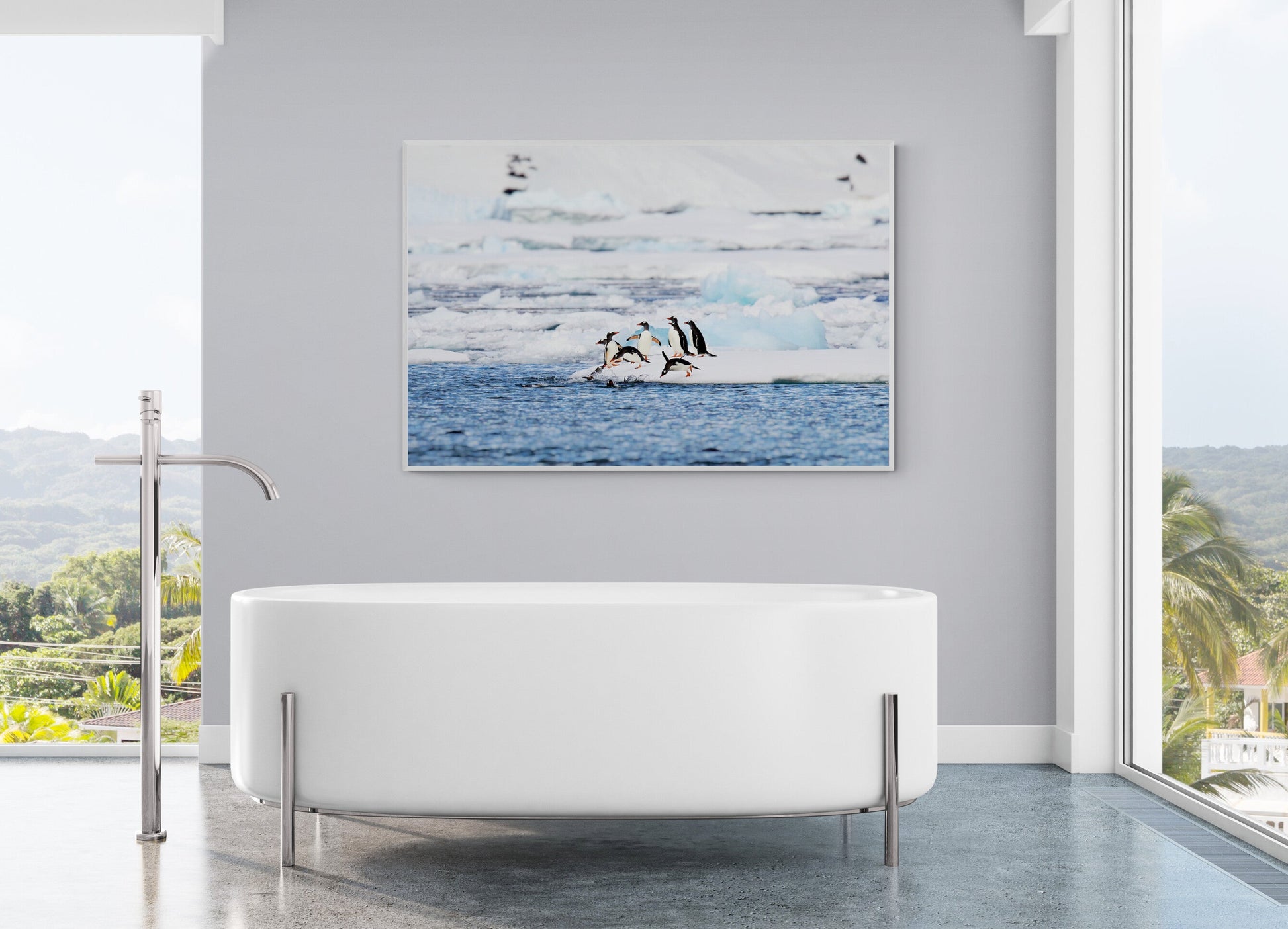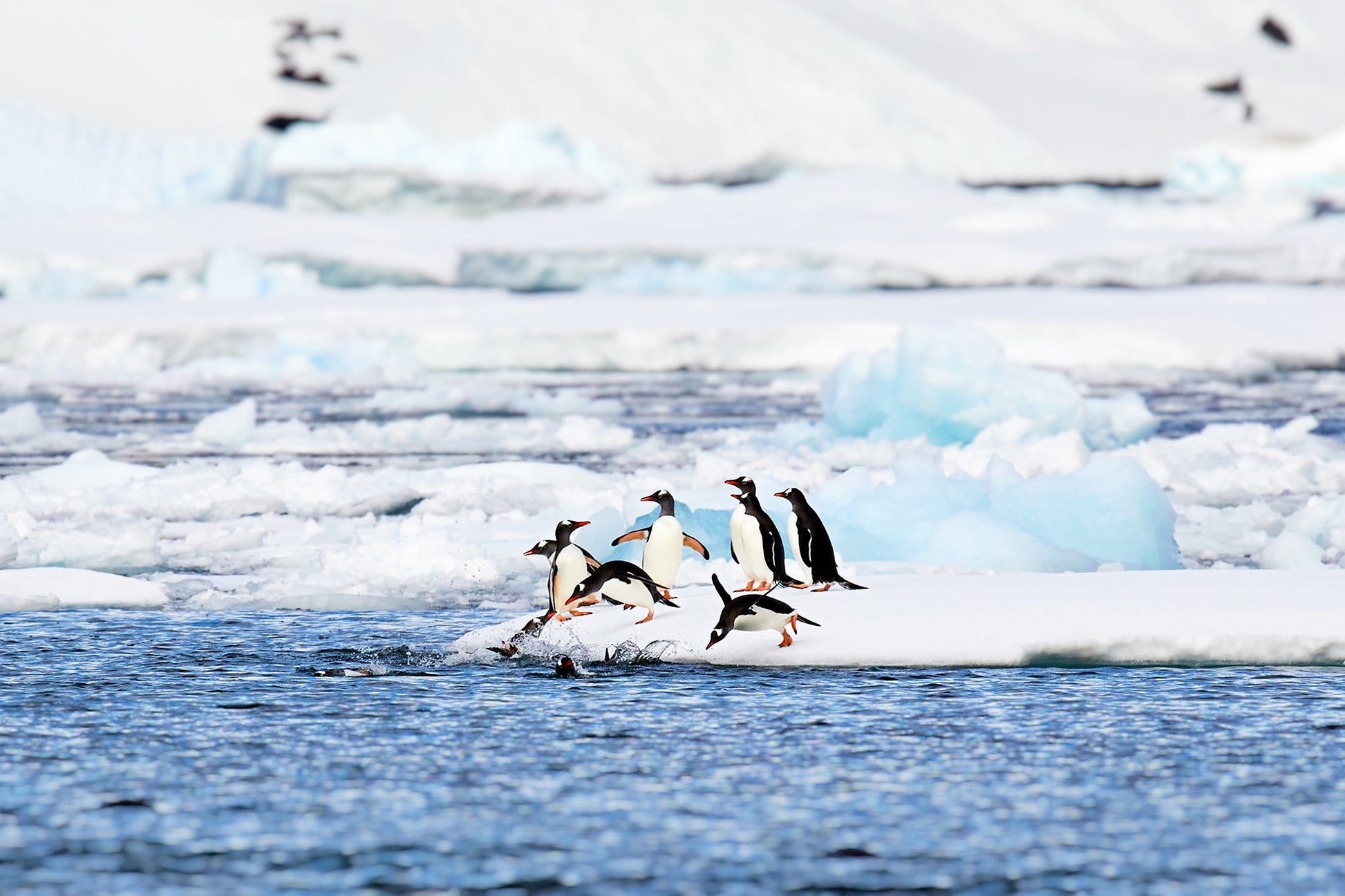 A group of Gentoo penguins gather on an ice floe in Antarctica. Sensing danger from our passing zodiac, they give the evacuation call and start their graceful dives into the freezing cold ocean.