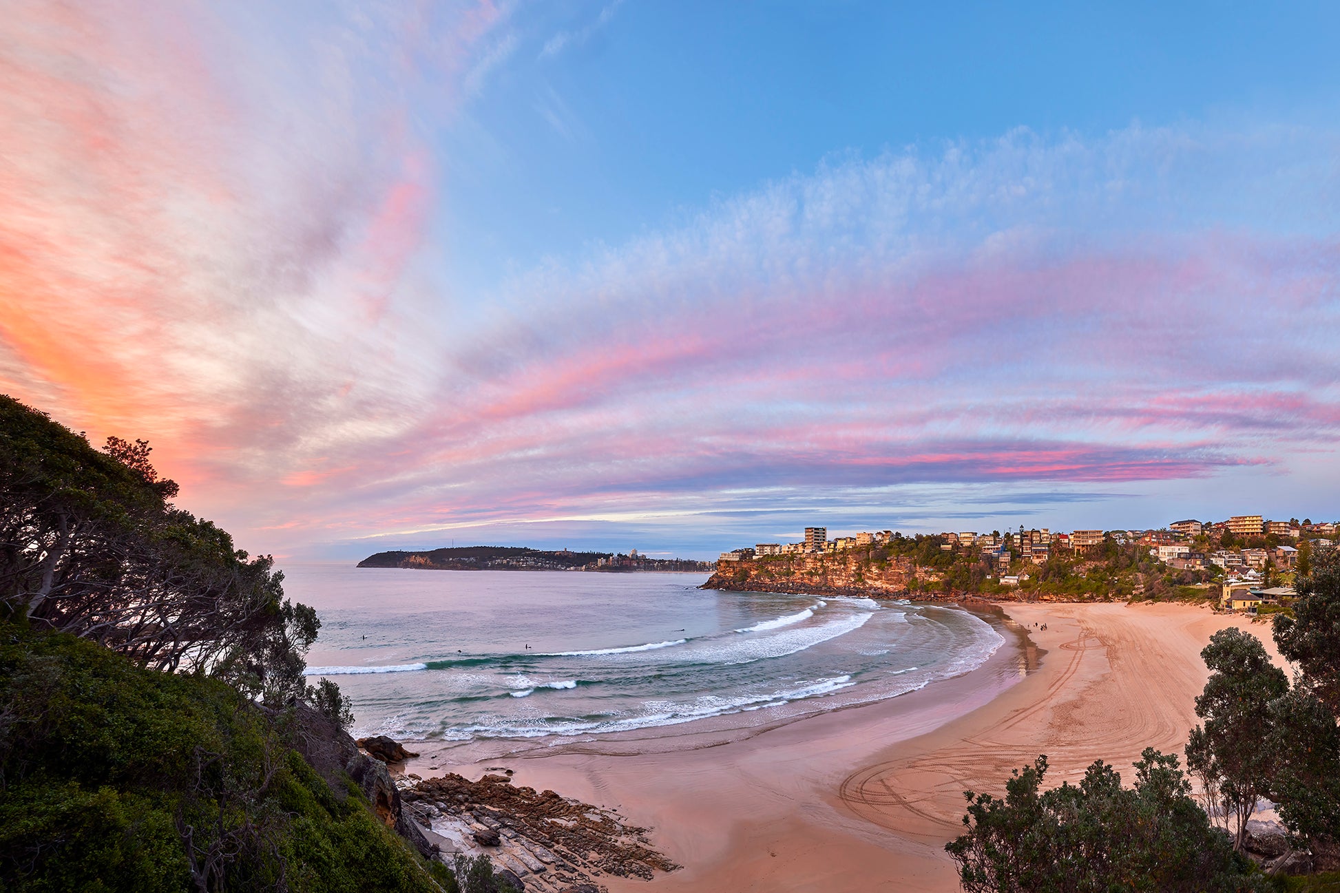 A magical start to the day at the picturesque Freshwater Beach. The sunrise paints everything in a palette of pastel pinks, from the clouds arcing across the sky to a sublime glassy sea. Despite the flat ocean, there is still a nice set of waves rolling into the bay for the surfers. It doesn’t get much better than this!