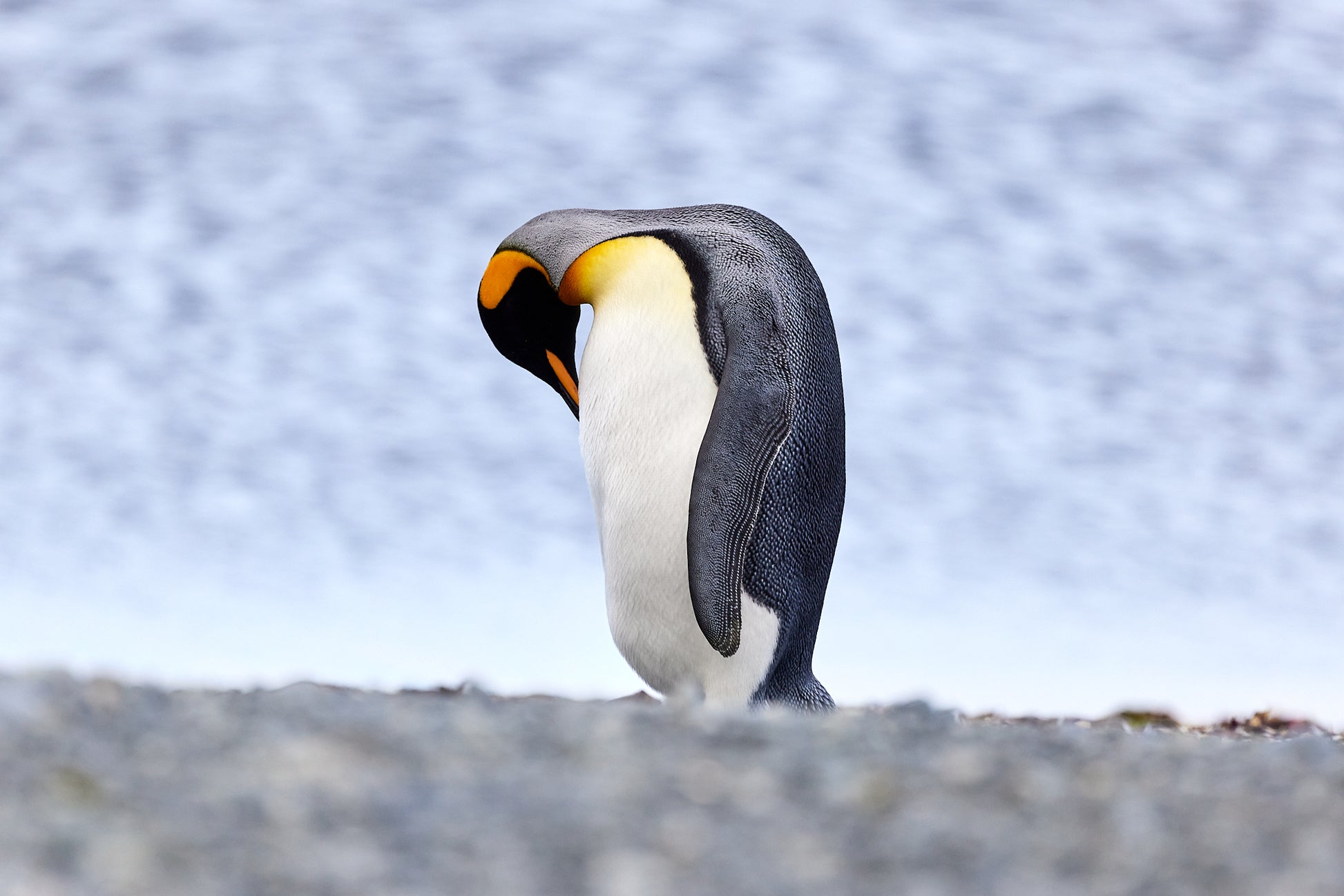 There is something special about the King Penguin. Living up to their namesake, they are truly the royalty of the penguin world. This King Penguins is preening his/her feathers to ensure their coat is in top condition to keep warm. This is an extremely important behaviour for penguins. Using their beaks, they spread oil produced from their glands across their plumage to stay clean, well-oiled and waterproof.