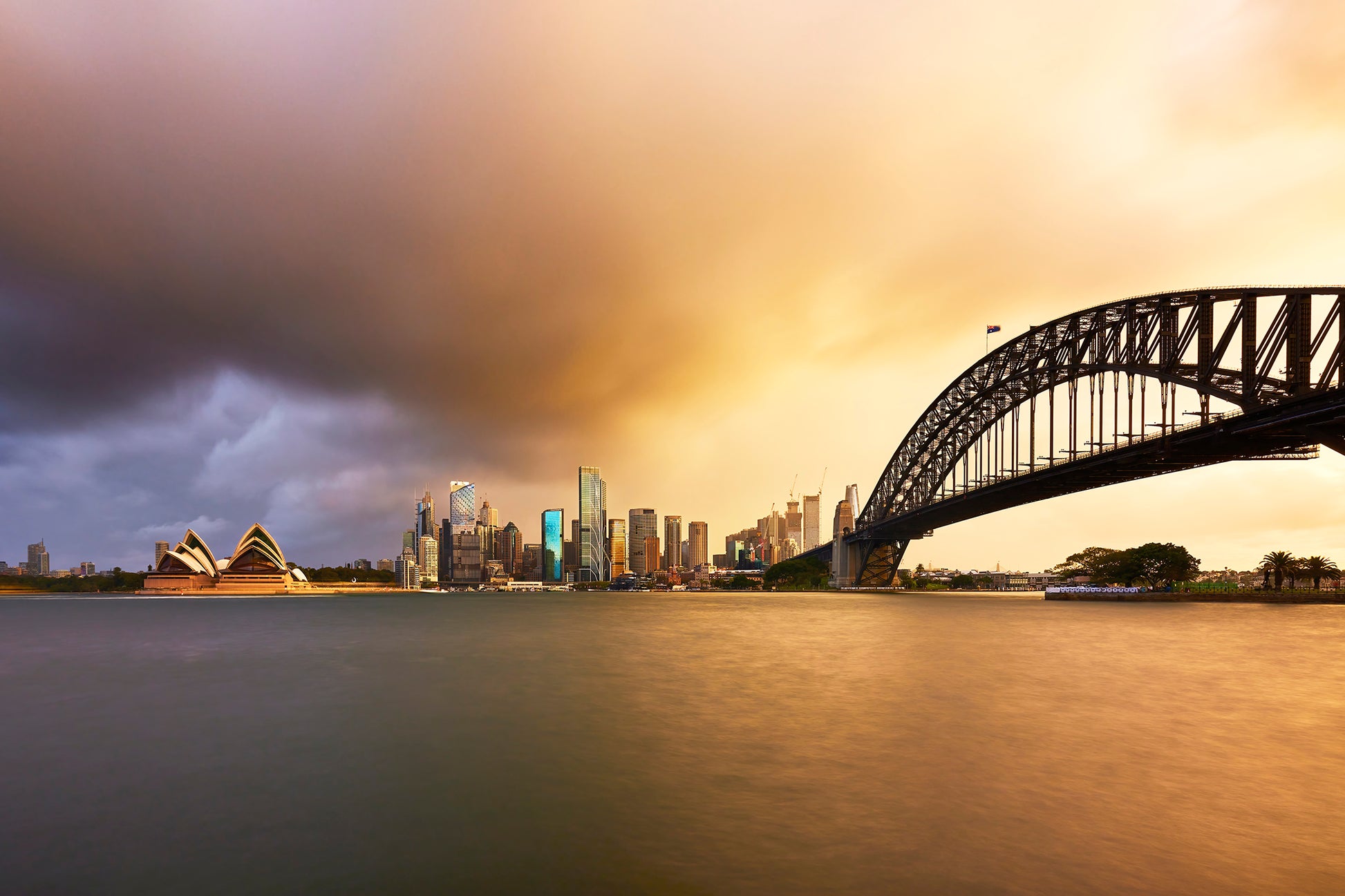 An epic golden sunset over Sydney Harbour as a storm front splits the sky in two. After enduring several drenchings from passing rain storms, my patience was rewarded as the sun finally broke free of the clouds in the west. The resulting sunset bathed the city in a last gasp of brilliant yellow light, whilst also painting the edge of the storm clouds in warm sunshine. In all my years of photographing Sydney Harbour, this was the most spectacular (and challenging) conditions I have ever witnessed. The resulting image incredibly captures the contrast of two weather events in one frame, simultaneously representing sunshine and  rain, punctuated by a heart of gold.
