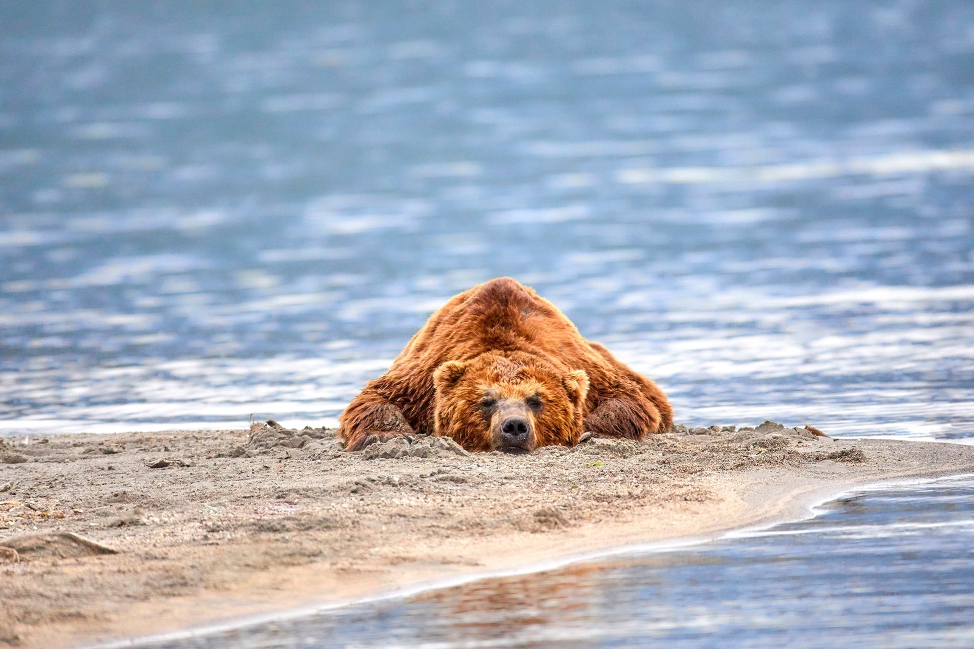 This brown bear takes a break from fishing for salmon in Kuril Lake, Kamchatka Russia. The lake is one of the largest spawning areas for Sockeye Salmon in the world, with somewhere between 2 to 6 million salmon coming here to spawn each year. It's no wonder this is one of the best locations in the world to photograph brown bears in their natural element.