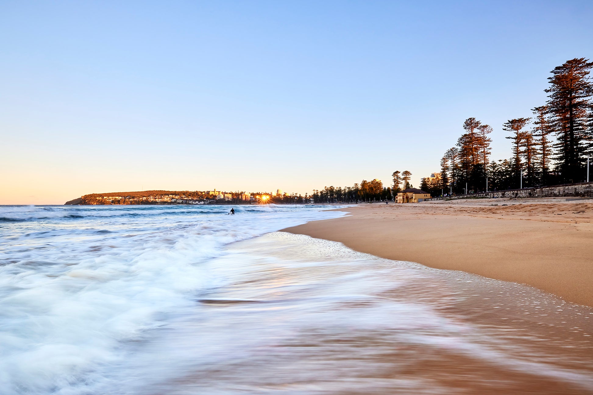 The first sun rays of dawn fall across the southern end of Manly Beach in a dazzling golden light. A sole surfer can be seen in the foam after his early morning surf session. This rising tide is a beautiful wash of white against the deep gold sand on the beach. The blurred effect is created by using a slow shutter speed to capture the movement of the water.