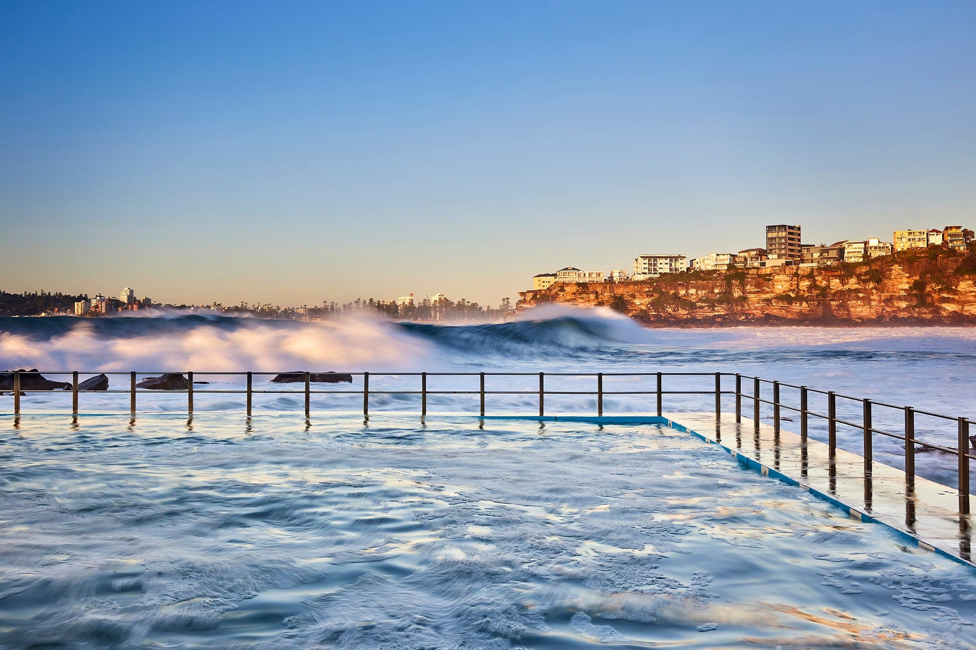 Huge seas in the bay of Freshwater Beach wash over into the rockpool, whipping the water into a boiling frenzy of foam. This particular weekend in June 2022 produced some of the biggest waves ever seen in the area. This shot was taken as the first rays of sunrise hit the crest of the waves and bathe Queenscliff Head in golden sunshine.