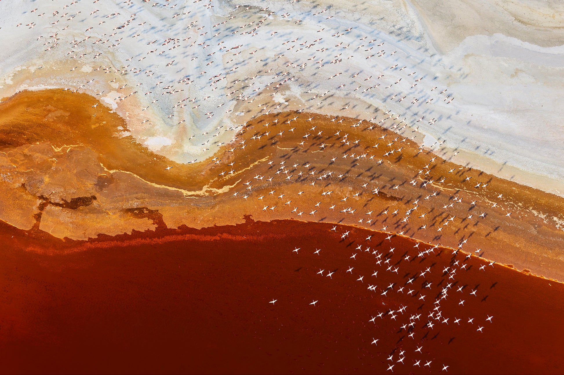 Like a squadron of pink bombers, these flamingos fly in perfect formation over an otherworldly landscape around Lake Magadi, Kenya. Flying at high altitude in a helicopter, I was able to capture this incredible image from high above the flamingos.