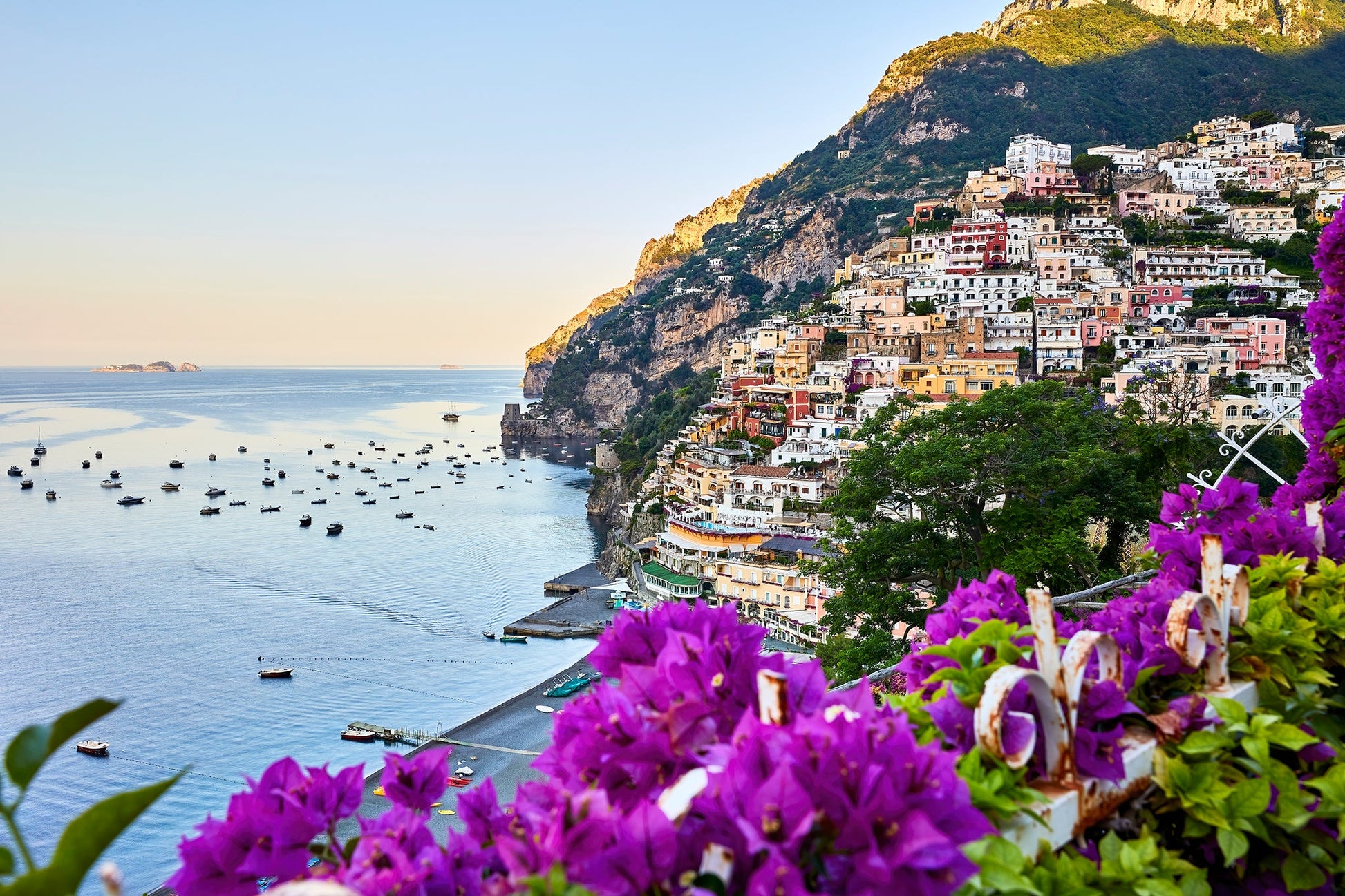 Looking pretty as a postcard, the seaside village of Positano is a kaleidoscope of colour everywhere you look. Brightly coloured stucco homes stack atop each other high into the hillside and the purple flowers of Bougainvillea seem to grow on every railing in sight.