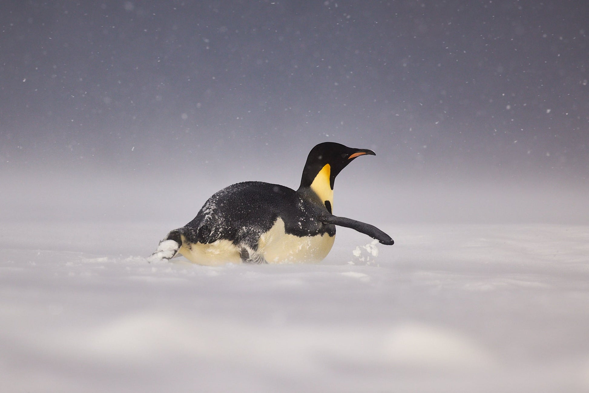 An Emperor Penguin slides across the fast ice in the Ross Sea, Antarctica. Unlike us humans who sink down into the waist deep snow with every step, penguins can make short work it by sliding along on their bellies. This magnificent male came over to check us out while we were photographing a group of Emperors, giving us a close-up encounter that you could only dream of.