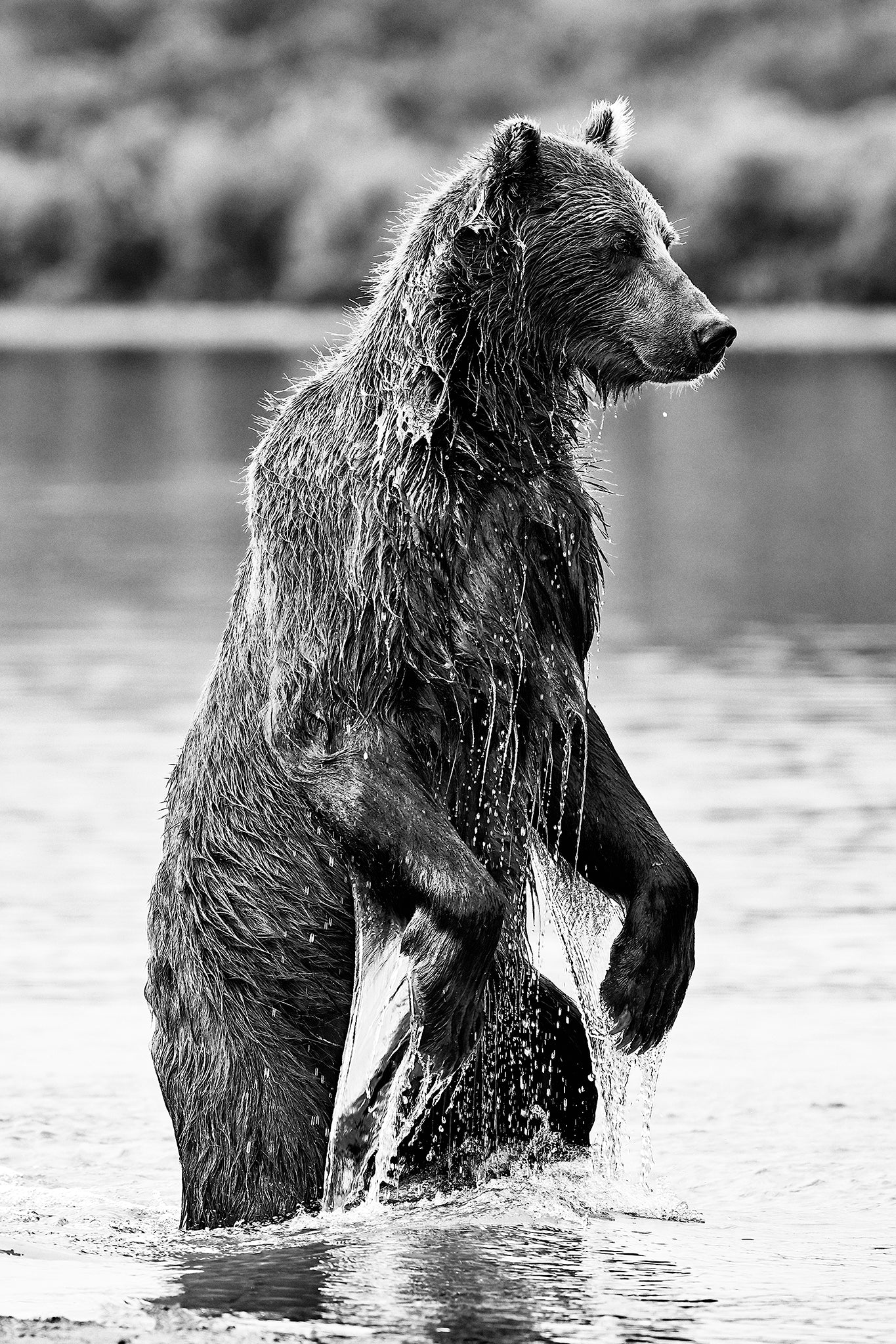 A brown bear stands tall above the water as he looks for salmon in Kurilskoye Lake in Kamchatka Russia. These guys are scary enough in real life, but when they stand it is really something to behold. It’s especially amazing to witness their speed and power once they lock onto their prey. In the blink of an eye the bear is completely airborn in an explosion of water, before emerging with his prize (hopefully a salmon and not you).