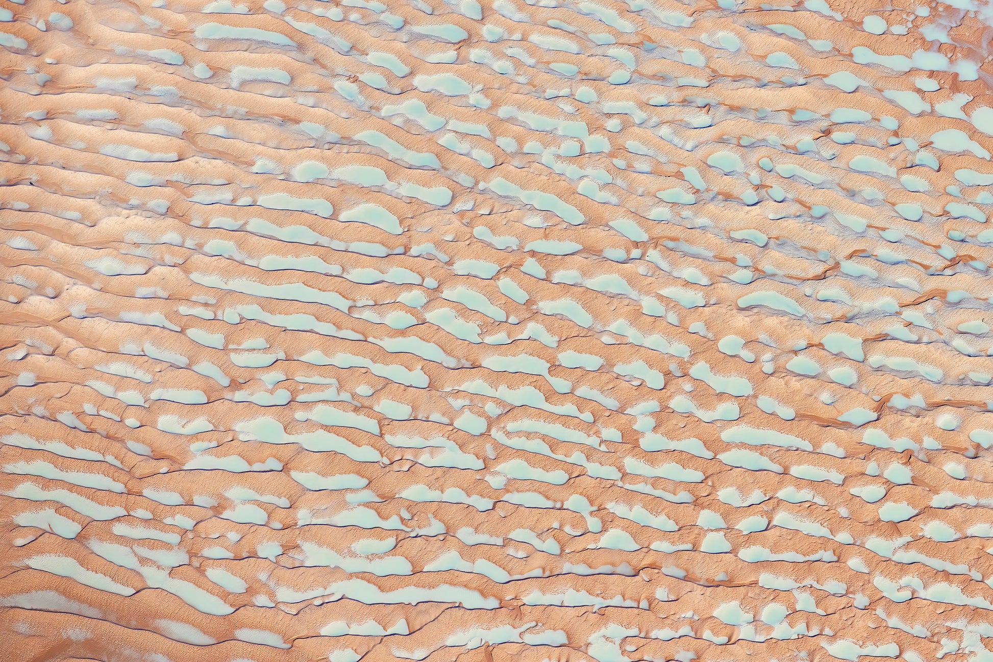 This shot was taken from a helicopter, from which I found this intricate pattern in the landscape. Like a giant spiders web, row upon row of mud catches the receding seawater to form this captivating natural artwork.